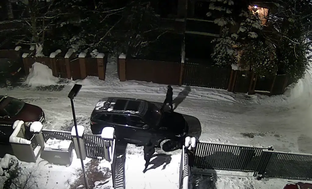 Nagranie z kamery przydomowej pokazuje próbę kradzieży Range Rovera Sport zaparkowanego na zamkniętym osiedlu. Do zdarzenia doszło w środku nocy. Złodzieje działali szybko i precyzyjnie, wykorzystując metodę „na walizkę”, czyli przechwycenie sygnału z kluczyka keyless.